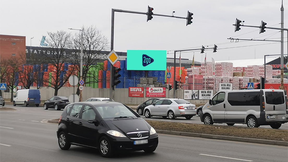 Lauko ekranas, įrengtas šalia statybinių medžiagų prekybos centro, Savanorių prospekto ir Sausupio gatvių sankirtoje – reklama, transliuojama ekrane, matoma vykstantiems Vilkpėdės, Naujamiesčio ir sostinės centro kryptimi.